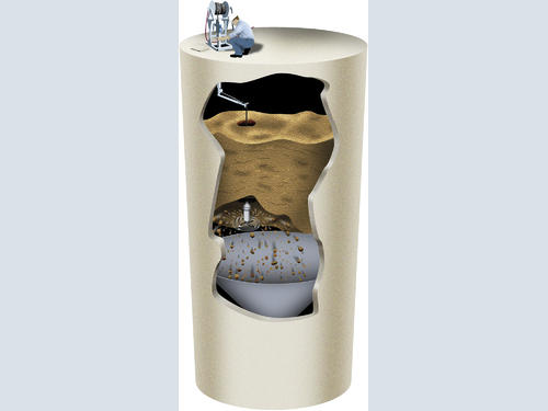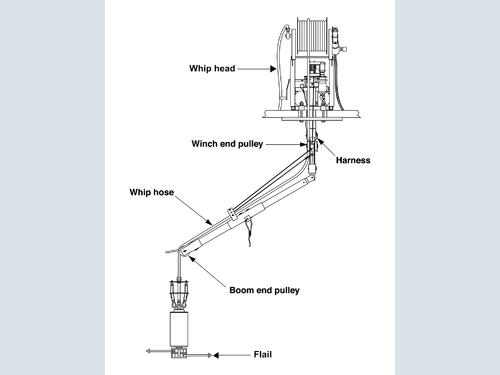 The whip can be set up quickly outside the vessel, and it’s portable enough to move easily around various bin sizes and shapes.  Typically lowered into the vessel from the top and then working from the bottom up to safely dislodge accumulation, the pneumatic cutting head delivers powerful cleaning action to remove buildup from walls and chutes without damaging the refractory.  Technicians lower the device all the way down through the topside opening, then start at the bottom of the buildup and work their way up, undercutting the wall accumulation as it falls by its own weight.  In extreme cases, a “bin drill” can be used to clear a 12-inch (30.5 cm) pathway as deep as 150 feet (45 meters) to start the process.