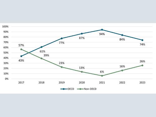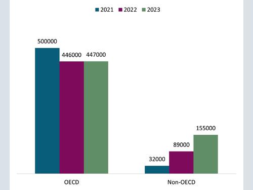 More than 26% was sent to non-OECD or developing countries. This is significantly more than the 16% in 2022, and 6% in 2021, when overall quantities were also lower, resulting in an increase of 500% in three years. This amounts to 155,000 tonnes sent to non-OECD countries, 15,000 of which was to European Union (EU) Member States Bulgaria and Romania, and the remaining sent to a combination of countries in non-EU Europe, Asia and Egypt.