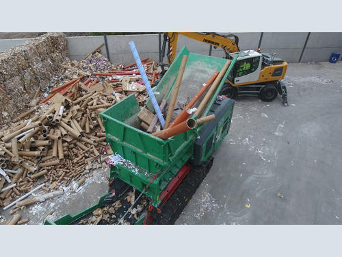 CRJ suggested the Haas Tyron 2000XL 2.0 (7-7/4) would be able to significantly boost their throughput tonnages thanks to its independently driven twin shaft configuration, and large tilting hopper that provides an aggressive infeed. The hopper also comes equipped with foldable extensions which further increase the size of the infeed area which is ideal for the long cardboard tubes present in this specific application.