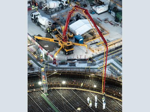 A four-day, 8,991 cubic metre continuous reinforced structural concrete pour, last week, marked the completion of the ‘Common Raft’ for HPC’s second reactor – the reinforced concrete platform on which the reactor, and other parts of the ‘Nuclear Island’ sit. Described by EDF Energy as J-0, completion of the base meets a date set more than four years ago and marks the transition from below ground activity to the construction of permanent reactor buildings above ground.