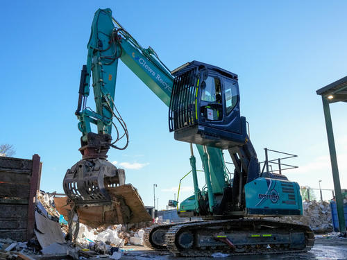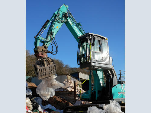 As the Kobelco will spend some of its time on the transfer station sorting out wastes on the ground, the decision to go for a standard excavator configuration was seen as a logical one opposed to a more expensive dedicated material handler specification more suited to loading recycling equipment and trucks. Fitted with a heavy-duty Demarec selector grab, the incoming waste can be quickly sorted into relevant waste streams and stockpiled in bays ready for outward loading. Despite the raising cab now having a substantial screen protection to both the cab top and windscreen, the operator says the view from the heated, air suspended seat is very good. Along with a full suite of LED working lights, the Kobelco has been fitted with a sturdy bucket ram guard to keep it from any potential damage whilst loading trucks. The outer edges of the upper structure have also been fitted with heavy-duty side impact protection designed to keep panel and component damage to a minimum.