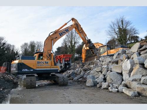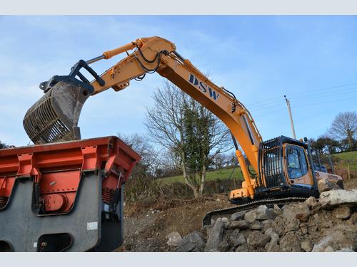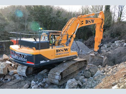The Hyundai 380LC-9A has been teamed up with a Sandvik crusher which are both working on the site of an old China Clay drying works not far from the town of St Austell, work here has been ongoing for some two-years and initially saw the company taking down old sheds that covered the area. Some asbestos had to be dealt with first, this task was performed by sister company ASW Environmental Ltd, and the timber roof was stripped down for recycling. The 380LC-9A and a 220LC-9A are now engaged in dismantling some heavy duty concrete structures which will be fed through the crusher for re-use as hardcore.