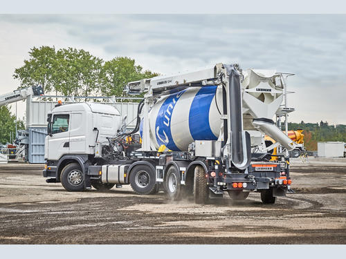 Liebherr's telescopic conveyor belt has been very successfully established on the market for 15 years. Up to now, the conveyor belt variant was only available for fixed-mounted truck mixers - from now on, the conveyor belt is also available in conjunction with a semitrailer and a large 12m³ drum. In addition to concrete, other materials such as sand, gravel, grit, screed and much more can be distributed directly on the construction site. This service is highly appreciated by the end customer because the material arrives immediately at the right place without a crane or wheel loader, which saves time and money.