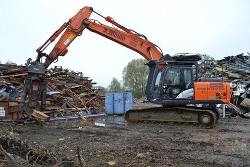 Working at Moulds recycling facility is the Hitachi Zaxis 210 complete with OQ70/55 and a range of attachments which include a VTN MT20 multi-processor fitted with steel jaws to process the oversized steel, with the addition of OilQuick the MT shear can easily be taken off and substituted for the Dynaset Hmag900 hydraulic magnet to load the sheared steel into the wagons and assist in generally keeping the site tidy of scrap metal.