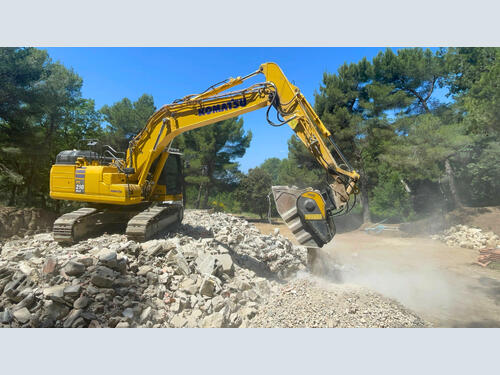 Integrated rebar-cutting blades and interchangeable teeth enable the pulverizer to handle every phase of the job. In practice, a single attachment that demolishes, sorts, and separates material directly on site.