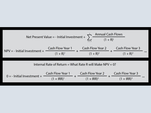 NPV is a financial measurement of life cycle costing where two or more options are evaluated based on initial price, annual costs and expected life as expressed in terms of today’s currency. Generally, the option with the highest NPV would be the wisest choice. IRR shows the annual compounded rate of return on an investment and is defined as the interest (or discount) rate that makes the NPV equal to zero.