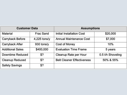 Purchasing decisions are often based more on price and what’s in the budget than on achieving performance (ROP) and reducing costs. A common question is: “This is what I have in the budget, what can you do for that?” The correct answer is often, “Nothing.” That’s because taking half measures usually only temporarily treats the symptoms of conveying problems and doesn’t address the root causes. To illustrate the point, a belt cleaning case study in Figure 4 analyzes using actual customer data and making some assumptions based on industry averages. [2][3]
