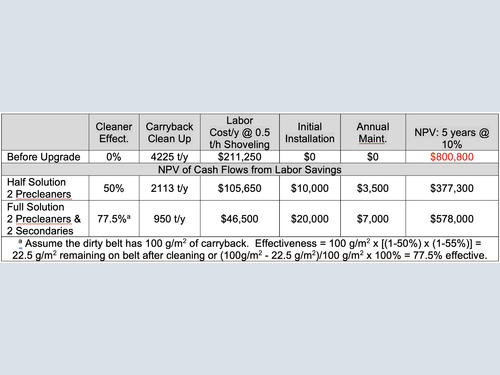 The 5-year time frame was chosen as a reasonable life for this type of equipment. Doing nothing is costing $800,800 in discounted cash flow over 5 years. For spending an additional $10,000 up front on equipment and $5,000 a year in maintenance, the additional cash flow for the full solution (installing two cleaners on each end of the reversing conveyor) compared to the half solution is $201,700 on labor alone for the dual cleaning system vs. a single belt cleaner on each end of the conveyor and $578,000 compared to doing nothing.