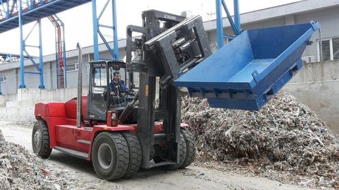 During the production process, heavy bales of waste paper must be picked up, transported, turned and emptied into large metal containers. To assist with the complex task of moving, lifting and rotating these heavy containers, Modern Enerji contacted KAUP, the German based forklift truck attachment manufacturer, to provide a solution to this material handling task.