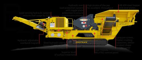 The H4e features Keestrack’s revolutionary “full-hybrid” diesel-electric drive concept: Supplied by a 346 kW/330 KVA diesel/generator module, a 130 kW electro motor drives the crusher. A separate electric driven hydro pump supplies all hydraulic components, such as tracks, hydraulic cylinders and the secondary screen. According to Keestrack this configuration allows energy cost savings of around 50% in diesel-electric mode. Supplied externally via gen set or mains those savings even extends to 80% with the on-board diesel engine remaining off. As a stand-alone unit or within a production line the Keestrack H4e perfectly meets all requirements for efficient secondary or tertiary crushing. The whole plant is monitored by a new control unit, fully integrating the hydraulic crusher settings control and monitoring system into the proven environment of Keestrack’s Relytec system. Following the enthusiastic market reaction on the 200-tph-model H4e Keestrack announces now the introduction of three larger cone crusher models with transport weights up to 70 tonnes and perfectly adapted to primary and secondary application in quarrying and mining.