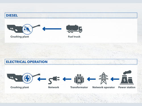 Electrically operated crushing and screening plants are initially more expensive due to their special equipment, plus the cost of cables (depending on the length of cable required) and a transformer.