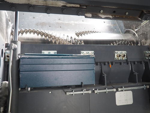 A hydraulic linear ram pushes the material – fully automatically and load-dependent – into the working area of the rotor. This process can also be programmed individually on request. The inclined ram and the very slow-turning rotor allow the machine to be emptied efficiently, which saves time when changing materials.