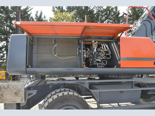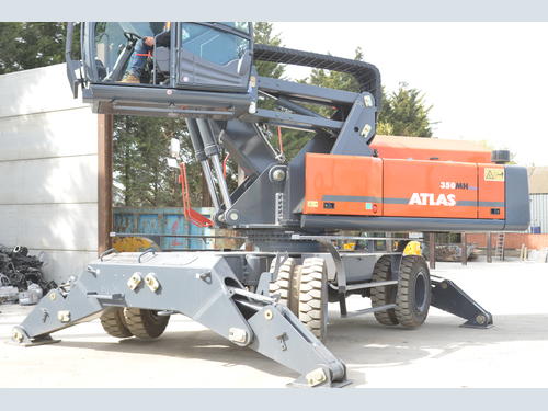 Access to the elevating cab is now safer and easier thanks to well placed non-slip steps and grab handles and once in the cab, all the controls fall easily to hand. A comfortable high backed seat, climate control and fully adjustable joysticks make for an environment any operator won’t mind spending a shift in. Impact resistant glass and a full cab guarding offer excellent operator protection and the smoothness of the electro-hydraulic control system means smoother loading and unloading of vehicles. Fitted with a dedicated 18.2m material handling configuration allows the operators to work in a far greater working zone, reducing the amount of times the machine needs to be moved during a shift. This latest model Atlas 350MH offers increased lifting capacity and faster cycle times and is capable of comfortably operating with a 700 litre E761 Atlas grab delivering enhanced productivity.