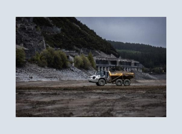 The Liebherr dump trucks are assisting with the backfilling of an embankment on which the new state road will run. For this purpose, they are transporting excavated material from the bottom of the drained Lake Reschen to the operating location. The dam will be about 70 metres wide and 20 - 22 metres thick. This corresponds to approximately 2.5 million cubic metres of earth.