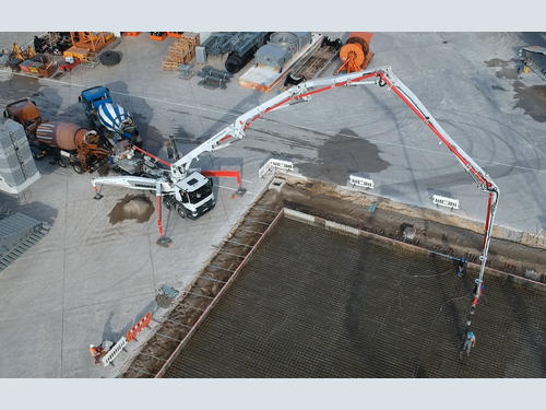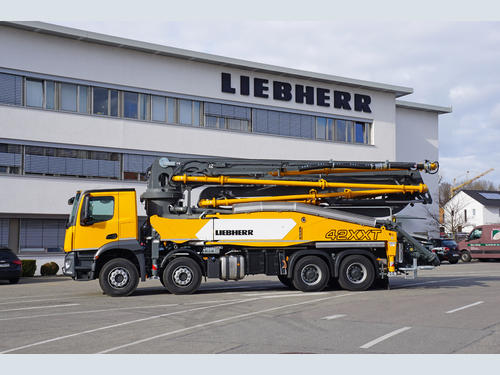 The 42 M5 XXT truck mounted concrete pump has now been in constant use at Betonpumpen-Union (BPU) in and around Ulm for two years. Most recently even during the concreting of a very massive base plate at the Liebherr factory in Ehingen, where mobile and crawler cranes are manufactured. To ensure the consistently high quality of Liebherr cranes, a highly load-bearing test area is necessary. For this purpose, a testing plate consisting of around 750 m³ of concrete was pumped with the help of the 42 M5 XXT truck mounted concrete pump. The full concreting work was completed in just one working day. Another Liebherr truck mounted concrete pump, the 37 XXT, was also on site.