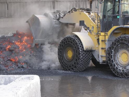 Not only is the cooling slag highly abrasive but loaders have to stand and manoeuvre over extremely hot surfaces.
