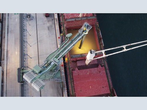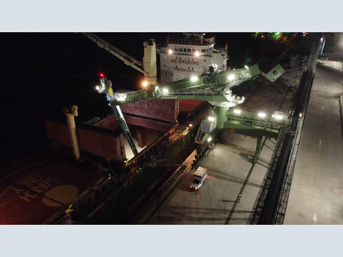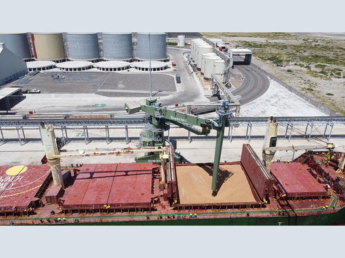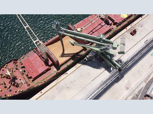 It has a continuous rated capacity of 1,200t/h and a peak one of 1,320t/h, discharging vessels up to 80,000 dwt. The unloader’s seamless flexibility enables it to handle a number of different grains such as corn, soya meal, dried distillers grains (DDGs), and canola seeds without any loss of efficiency.