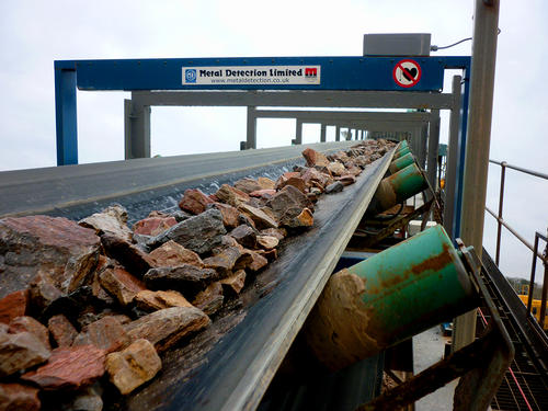 Commonly, the Overband Magnet works in conjunction with a Metal Detector. The Metal Detector identifies non-ferrous metals such as manganese steel. On the stand will be a Model TN77 Metal Detector, one of the most popular used in quarries and mining operations all over the world.