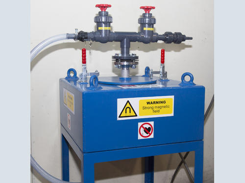 High intensity Magnetic Separators are used to remove weakly magnetic particles from non-metallic minerals such as feldspar and silica sand. The Electro Magnetic Filter on display is designed to remove magnetically susceptible minerals from mineral and ceramic slurries and glazes. An electromagnetic coil is used to project a high magnetic field into a centralised cannister containing a magnetic matrix. During processing, magnetic particles are captured on the points of the matrix. A larger Electro Magnetic Filter has just been added to the Master Magnets mineral processing laboratory in Redditch UK. This provides mineral processors with the opportunity of conducting controlled tests to prove the separation capability.
