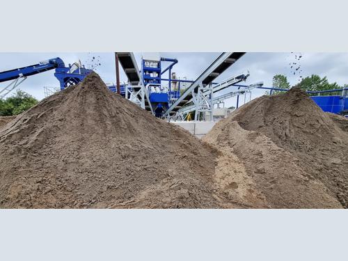 The new recycled aggregate washing plant is processing a combination feed of recycled materials containing anything from ‘muckaway’ to utility waste, trommel fines and the quantity of sand and the ratio of the sand/silt fraction completely varies in every bucket load going into the plant. However, the plant has been designed to accept a remarkably diverse feed whilst still retaining throughput.