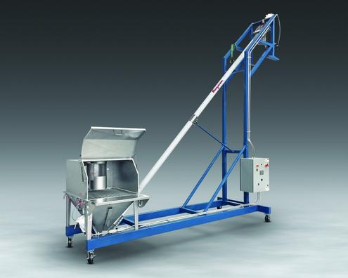 A new FLEXICON® Mobile Flexible Screw Conveyor with multi-purpose hood transfers material discharged from bulk bags and/or manually dumped from handheld sacks into elevated process equipment or storage vessels dust free.