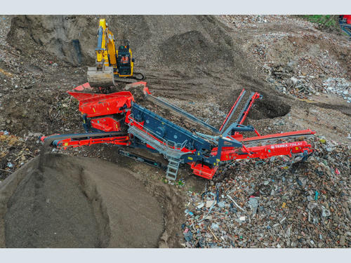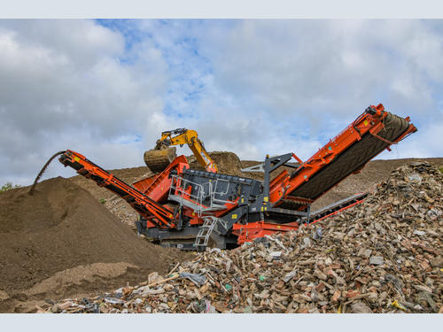 The quick and effective recycling of C&D waste is handled by a pair of machines from the Terex Finlay range of equipment offered by Molson Finlay. Incoming material is put through a new 883+ Spaleck heavy-duty screen to ensure even the most awkward of material is processed efficiently. The Spaleck screen box has a unique, stepped, 3D punch plate top deck combined with flip-flow bottom deck technology and allows flexibility to work in a range of difficult materials. The vibrating screen is almost blockage and maintenance free and has a processing range between 1mm and 120mm. Powered by a Tier 4F 4.4 litre Caterpillar engine, the 883+ is very quiet in operation and ideal for noise sensitive areas. The 30.5t screen boasts 3 hydraulically adjustable conveyors to discharge the material.