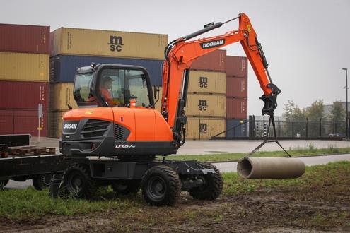 Equipped as standard in the single tyre configuration, the operating weight of the DX57W-5 is 5.79 tonne. A dual tyre configuration is available as an option. The DX57W-5 offers two travel speed ranges, with a maximum travel speed of 30 km/h.