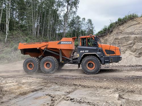 Like all Doosan ADTs, the new DA45 features an articulation hinge positioned behind the turning ring to provide equal weight distribution to the front axle even during maximum steer articulation. This combined with a free-swinging rear tandem bogie ensures equal distribution of weight to each wheel and guarantees permanent 6-wheel contact and drive for equal power distribution and excellent performance particularly on difficult terrains such as soft ground, uneven surfaces, very steep slopes, tight turns or a combination of all of these difficult conditions.