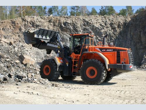 With a bucket capacity of 5.4 m3, the DL580-5 top-of-the-range wheel loader has a similar look to the next model in the range, the DL550-5, but features robust structural components and an advanced sophisticated double circuit axle oil cooler system. This provides an ideal solution for applications such as block lifting and other heavier material-handling needs in industrial, construction, recycling, mining and quarrying applications.