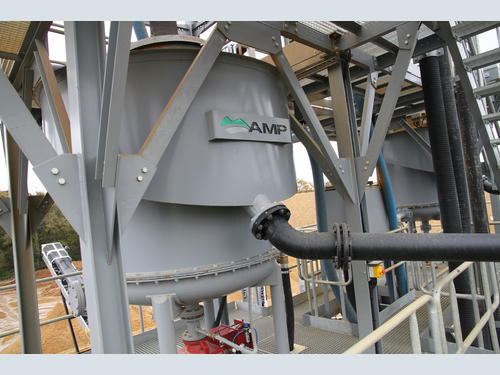 The main product, sand falls through the bottom deck which is then pumped from the rinsing screen up to the twin 500mm hydro cyclones of the AMP sand plant. Consisting of a high-energy 3.2m x 1.5m split dewatering screen and two 150/100 pumps each separately for sharp and soft sand the specification is completed with one TAK 161 as the upward current classifier for soft sand and a second TAK 161 as the upward current classified for sharp sand.