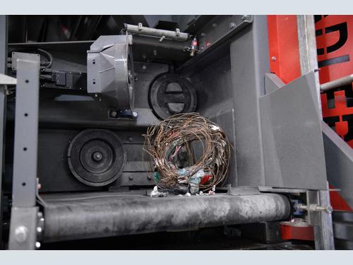 The bales are fed onto the machine by an independent conveyor, guided by a moving push plate onto the floor plate, which keeps the bale in position. Sensors located above the input conveyor, inside the chamber and on the flap ensure the bale is positioned correctly with high precision. Once the bale is in position, combs are pushed into the bale to fix the wire for cutting. The bale measurement system ensures the cutters move in the bale correctly. When the cutting is done, the combs pull out and the wires are coiled up and discharged by a small integrated conveyor into a separate bin, ready for recycling. The floor plate opens and the bale falls onto a conveyor placed below the machine, which will feed the material into the sorting system.
