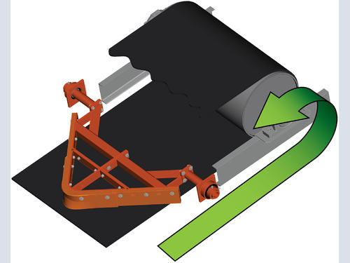 Mounted to hanger bars by clamps or welding, the unit glides on the return side of the conveyor belt using hinge system, deflecting any fugitive debris off of the belt.  The assembly holds an easily replaceable 4 in. (100 mm) wide, 1 in. (25 mm) thick blade, which provides 2 in. (50 mm) of wear life.  Blades are available in 60 Shore A durometer nitrile rubber or long-wearing 90 Shore A durometer urethane and can be ordered with specialized blades that are chemical resistant or designed for high temperature applications.