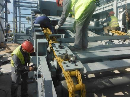 The chains on the Hybrid Feeder are not underneath the conveyor as they are on the Arched Plate Conveyor, but are lateral, so that the conveyor sections are on the same level as the mid-point of the chain bolts. This was the technical solution which fulfilled the requirement of a fixed belted surface. This AUMUND design results in a lower overall height and a slightly wider machine, with a centre distance of 7.2 m, chain width of 3 m and belt width of 2.6 m. It is closed in with a dust cover and has a top-mounted filter, as well as a slewing grate, cleaning brushes and catching strips, for the fine, spherical bulk material.