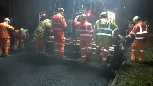 The challenge was to lay two layers of base course at 90mm each plus a binder course of 70mm, adding up to a total of 250mm, plus a Tuffgrip thin surfacing of 40mm, all between 22.00 (after planing) and the morning cut off point.