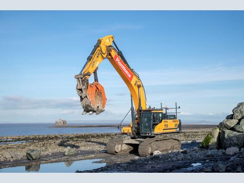 One of the larger items on the Plantforce stock list at Hinkley is a Hyundai HX520LC – the machine is fitted with a huge Geith fixed-leg rock grab. With the earthworks almost at an end, one of the tasks set for the mammoth Hyundai was completing a section of rock armour installation.