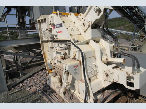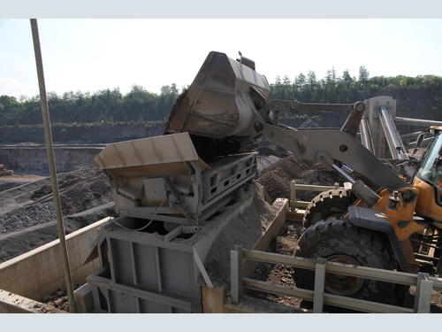 As-dug material is delivered by wheel loader into a 30-ton capacity heavy duty hopper. Material is the then fed up a 36m inclined feed conveyor and delivered onto the 6.1m x 1.6m double-deck rinsing screen, where sand drops through the bottom deck with any aggregate greater than 20mm returned on a 36m closed circuit conveyor, under an overband magnet, into a surge bin before being fed in to an impact crusher via a vibratory feeder, with the crushed material returned back to the primary wash screen via the feed conveyor.