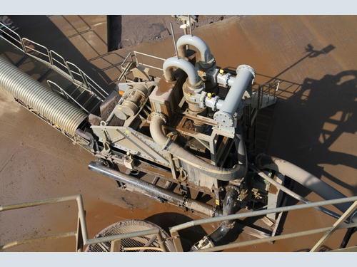 The sand plant has two, rubber lined cyclones fed by a single 200/150 pump. The cyclones are manufactured in such a way that the choice of three feed tubes, three vortex finders and seven apexes, give the flexibility to fine tune the end product, to the customer requirements. The overflow with minimal losses goes to the lagoon and the underflow is deposited onto the 3.7m x 1.5m dewatering screen before being fed via a polyethylene lined chute onto a 15m conveyor to stockpile.