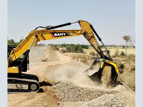In India, they used the Sany SY220 and an MB-S18 screening bucket during the actual construction, while in Italy the same rotary bucket model was mounted on a Hitachi EX215 to sift at the quarry, salvaging materials and loading the truck in one unique motion.