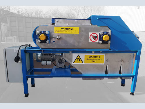 The Rare Earth Roll Separator features a 200mm diameter head pulley on a short conveyor, constructed using high-strength permanent neodymium rare earth magnet rings sandwiched between steel pole pieces. A vibratory feeder delivers an even, controlled feed of shredded material onto a thin conveyor belt. This belt transports the material into the high-intensity magnetic field of the head pulley, which attracts magnetically susceptible metals and materials, altering their final trajectory and enabling a separation using a strategically placed splitter.