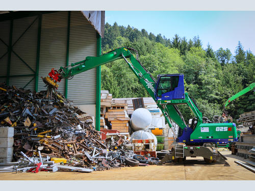 Dedication, reliability and a preference for multifunctional tools – all these things are often attributed to Swiss people. Presumably these are exactly the reasons why Fritz Blaser, Managing Director of the Swiss company Reinhard Recycling AG, has decided to use various SENNEBOGEN material handlers for years. In the meantime, the fleet of the recycling experts has grown to eight machines: including a 355 E telehandler as an all-rounder on the site since 2019, an 830 E material handler on crawler tracks equipped with an electric drive and an 825 E mobile for flexible sorting and material handling tasks with a quick coupler installed on the grab stick...