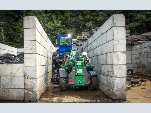 The SENNEBOGEN 355 E, with practical details such as the elevating cab, combines the advantages of a telehandler and wheel loader in one machine and impresses with its high processing quality. It completes its tasks with utmost precision and performs both sorting and loading work on the Swiss recycling site: The 355 E is particularly effective at processing the heavily compacted and dense pruning waste thanks to its high breakaway force of up to 85 kN. "We use the 355 E machine wherever it is needed at short notice: Whether for various loading activities or for transporting the used tires with a 3 m³ shovel," explains Fritz Blaser. "Even in our narrowest sorting boxes, which are only 3 m wide, it moves in without any problems and remains maneuverable".
