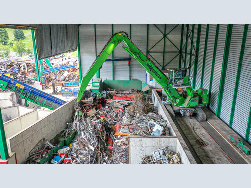 Reinhard Recycling has been a loyal SENNEBOGEN customer since 1994 and has been working with sales and service partner Kuhn in Switzerland for well over 10 years, as they appreciate the dealer's consultancy and reliable service. During this time, numerous projects have been implemented to streamline recycling processes on site. The recycling company now operates a total of eight machines, including almost the full range of recycling tools that SENNEBOGEN has to offer: a SENNEBOGEN 830 E material handler in the tracked version with an electric motor that feeds the shear in a partially open hall, two 821 and three 825 mobiles, the latest on site with a quick coupler for flexible sorting of the material, a 643 telescopic crane and a 355 E telehandler as an all-rounder in the narrow sorting boxes. A special feature? Like the 830 E in the crawler version used by Reinhard Recycling, SENNEBOGEN material handlers are supplied with the striking green paint finish as standard. Fritz Blaser has opted for his own corporate colors for the rest of the fleet, so the machines shine in a combination of eye-catching mint green, ultramarine blue and a red logo on the rear ballast.