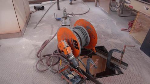 The experienced two-man crew immediately set up a Martin® Heavy Duty Whip. Powered by compressed air, the device can be equipped with a variety of flails and cutting edges to knock down accumulated material without damaging the silo’s walls or support structure. Requiring no confined space entry, the device was set above the manhole opening at the top of the vessel and manoeuvered by remote control.