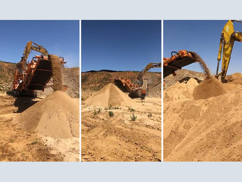 To crush heavily compressed sand in a sand quarry was a second, very different task for a Rockster impactor. The sand is excavated with a vibro-ripper from an extremely strong quarry wall. “This ripper produces solid lumps of sand. Then the excavator loads lumps into the crusher with a 5 mm screen, and we get great sand,” says CSB owner Lurii Lisnichenko. With the screening system mounted onto the crusher it is easy to produce an exact defined final grain size in one pass. In Morocco, sand obtained from a quarry is a product of high demand. The cost can range from 100-110 Dirham per m³ (10-11 USD) and it is sold directly from the quarry.