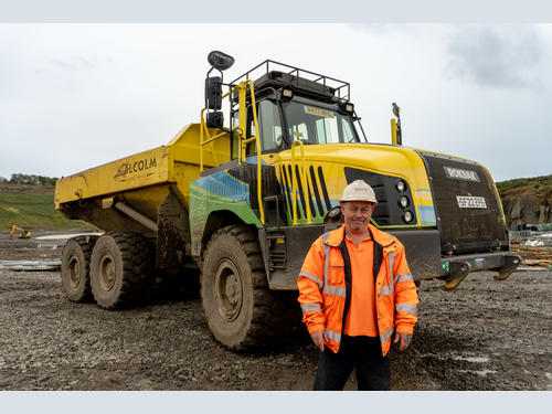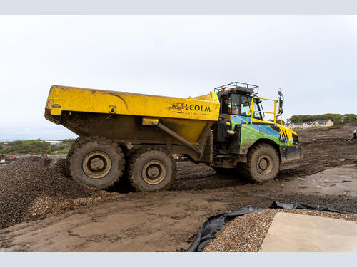 Material can be Type 1, pre-bedding, 40mm sub-base or rock. Once it has been collected, the truck leaves the site out of the main gate and travels two miles up a main road to another area at a higher level of the site. Following the deposit, it travels the two miles back down to the lower ground level where the main groundwork takes place.