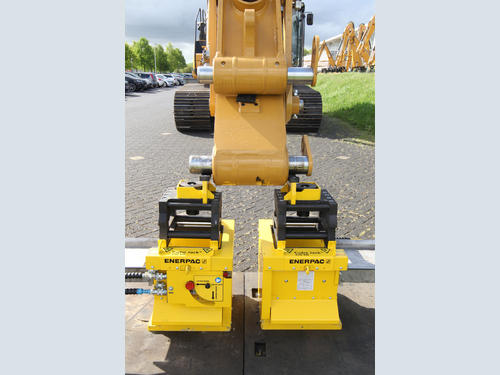 The Enerpac cube jack lifting system offers a safer, CE-certified, approach to removing the undercarriage. It comprises two pairs of cube jacks providing coordinated hydraulic lifting of loads up to 25T per jack to a height of 2m. Two cube jacks are positioned under a lifting beam at the rear of the excavator, while two cube jacks are located under the arm’s bucket lugs. Each pair of cube jacks is connected to a hydraulic pump to synchronously lift and lower the excavator body and arm.
