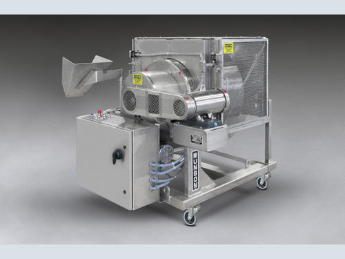 Proprietary mixing flights within the rotating vessel turn, cut, fold and tumble material onto a rotating intensifier that reduces soft agglomerates into discrete particles. The 0.75 kW gear-reduced drive of the vessel and 1.5 kW drive of the intensifier are wash-down rated, and adjusted by variable-frequency controls housed in an IP 66-equivalent (NEMA 4X) stainless steel wash-down enclosure.
