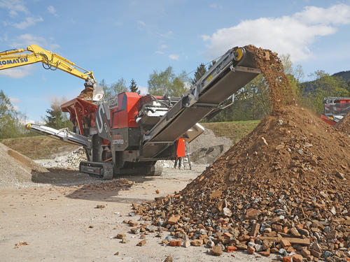 The extensive testing area at the Liezen plant offered plenty of space for an almost complete presentation of the SBM programme of track-mounted jaw and impact crushers, which has meanwhile been expanded to a total of ten standard models with operating weights between 30 and 60 tonnes. Also on display were various semi-stationary processing solutions and the company’s successful concrete mixing technology. However, the focus was on performance-oriented demonstrations of the fundamentally redesigned JAWMAX 400/450 series and the REMAX 450 impact crusher, based on the REMAX 400 model already introduced in 2018. The common feature of both new "450s" is a high-performance pre-screening unit that effectively separates contaminated or valuable material, thus reducing crusher wear while noticeably improving the crushing result in terms of quality and output. The new double-deck pre-screen is designed as a circular vibratory screen and is directly connected to the vibrating chute in the feed hopper. Via a triple flap on the screen run, the two fractions can be discharged in full or in part as fines or added to the end product as crusher bypass. Compared to the double-deck grizzly feeders of the 400 models, the pre-screen increases the hourly capacity by about 50 tph to a maximum of 450 tonnes per hour, which positions both the 49.2 tonne REMAX 450 with the large "1300" impact crusher and optional secondary screen, and the compact JAWMAX 450 at the top of their respective performance classes.