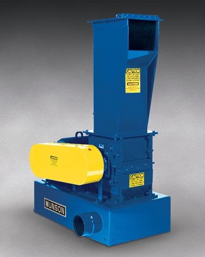 The PDC is also working to develop cellulose insulation as a replacement for fibreglass in residential construction. Here, the Center has developed unique systems to clean and process recycled newspaper and cardboard before it is reduced. Both Munson’s SCC cutters and its Attrition Mills are being considered as size reduction solutions. The Attrition Mill granulates by means of a disk rotating against a circular grinding plate, producing particles within a relatively narrow size spectrum down to 200 mesh (75 microns). It is employed primarily for reduction of fibrous materials, but is also suitable for friable products. Mr. Paradis said the PDC is leaning toward the Attrition Mill because it can produce a fibrous, fluffy, “cotton candy” type product with an excellent R-value.