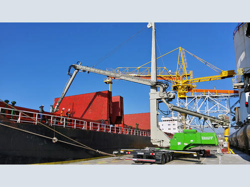 Siwertell road-mobile unloaders deliver totally enclosed material handling from the ship’s hold to the receiving system, which minimizes dust emissions and eliminates spillage entirely. Furthermore, they have a dust filter installed at the top of the loading conveyor, creating negative pressure to minimize fugitive dust at transfer points. The filter automatically returns collected dust to the conveying system.